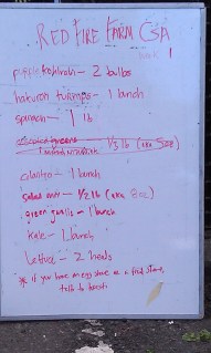 The goods come from Red Fire Farm, located in Granby, MA. I am doing a 20-week vegetable share and a fruit share, and splitting it with a friend.
