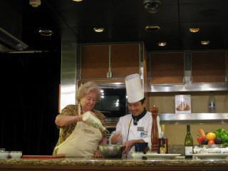 I spent seven days on the ms Veendam (Holland America Line). If you’ve never cruised before, think 3- and 4-course breakfasts and lunches, and 5- and 6-course dinners. It would be quite possible to be eating at all times on the ship, if your stomach could handle it. Since my return to shore, my stomach has been in revolt since I don’t normally eat that many courses throughout a day, as I’m sure you’re surprised to find out. While the courses are plentiful, the portion sizes are refreshingly un-American. If you order the filet mignon, don’t expect a 10-ounce piece of beef. It was actually about the size of a deck of cards, that standard measure we dietitians love to use.