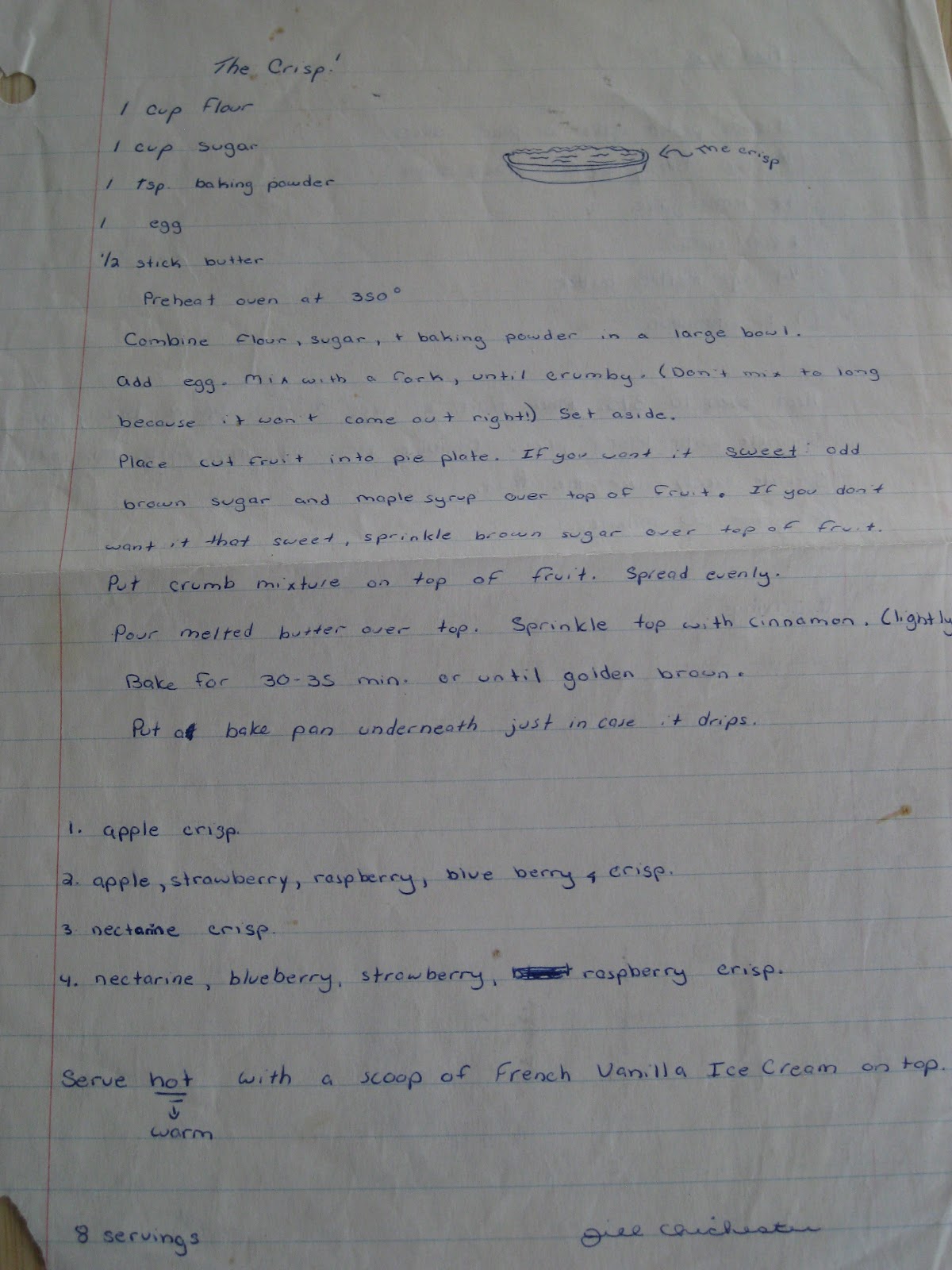 With all the peaches I’ve been getting in my CSA, I decided to dig out a recipe for “The Crisp!” that was given to me by a childhood friend. I’ve had this in my recipe box since high school, or earlier, and it’s handwritten on yellowing loose-leaf notebook paper. I’ve been trying to clear out some of the paper recipes in my file (and pile), but I think this one is just too good to get rid of…I especially love the illustration and her autograph at the bottom of the page.