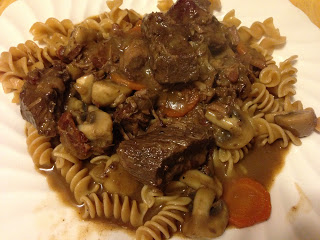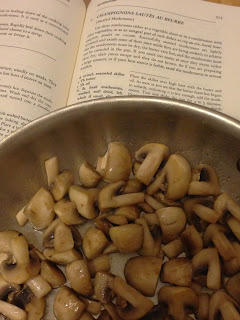 While the beef is cooking (2.5-3 hours once it gets in the oven the second time), the recipe calls for making two additional recipes: Brown-braised onions (18-24 pearl onions) and Sautéed mushrooms. I opted to skip the pearl onions, but I did make the mushrooms. The dietitian in me just had to decrease the butter a bit (the recipe called for 2 Tbsp butter and 1 Tbsp of oil for 1/2 lb of mushrooms).