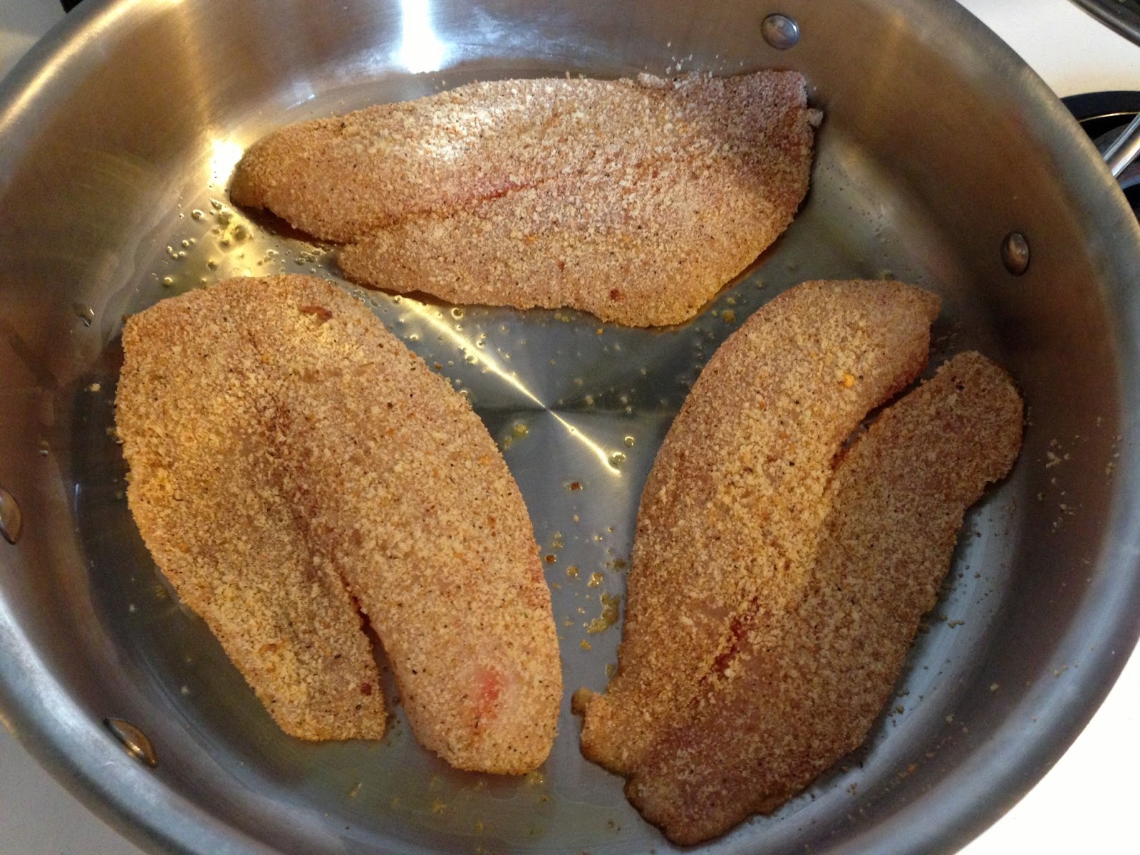2. Heat olive oil in a large saute pan on medium heat. Add breaded tilapia fillets and cook until lightly browned, about 5 minutes.