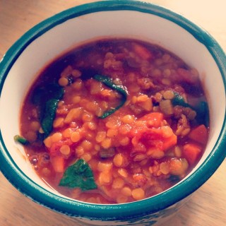 I was inspired to make a red lentil soup based on two vegan recipes I came across. However comma, I went the opposite of vegan and used chicken broth and added crumbled bacon! I always have a hard time estimating ingredients from the bulk bins and this time was no different – I ended up with a little more than 1 cup of red lentils instead of 2 cups. They also took quite a bit longer to cook than the 20-25 minutes specified in the recipe. Feel free to adjust the amount of broth based on the consistency of soup you like. I started out with just 4 cups of broth, and then ended up adding an additional 2 cups of water as the soup cooked and thickened up.