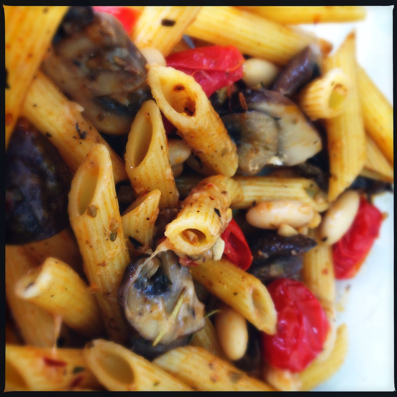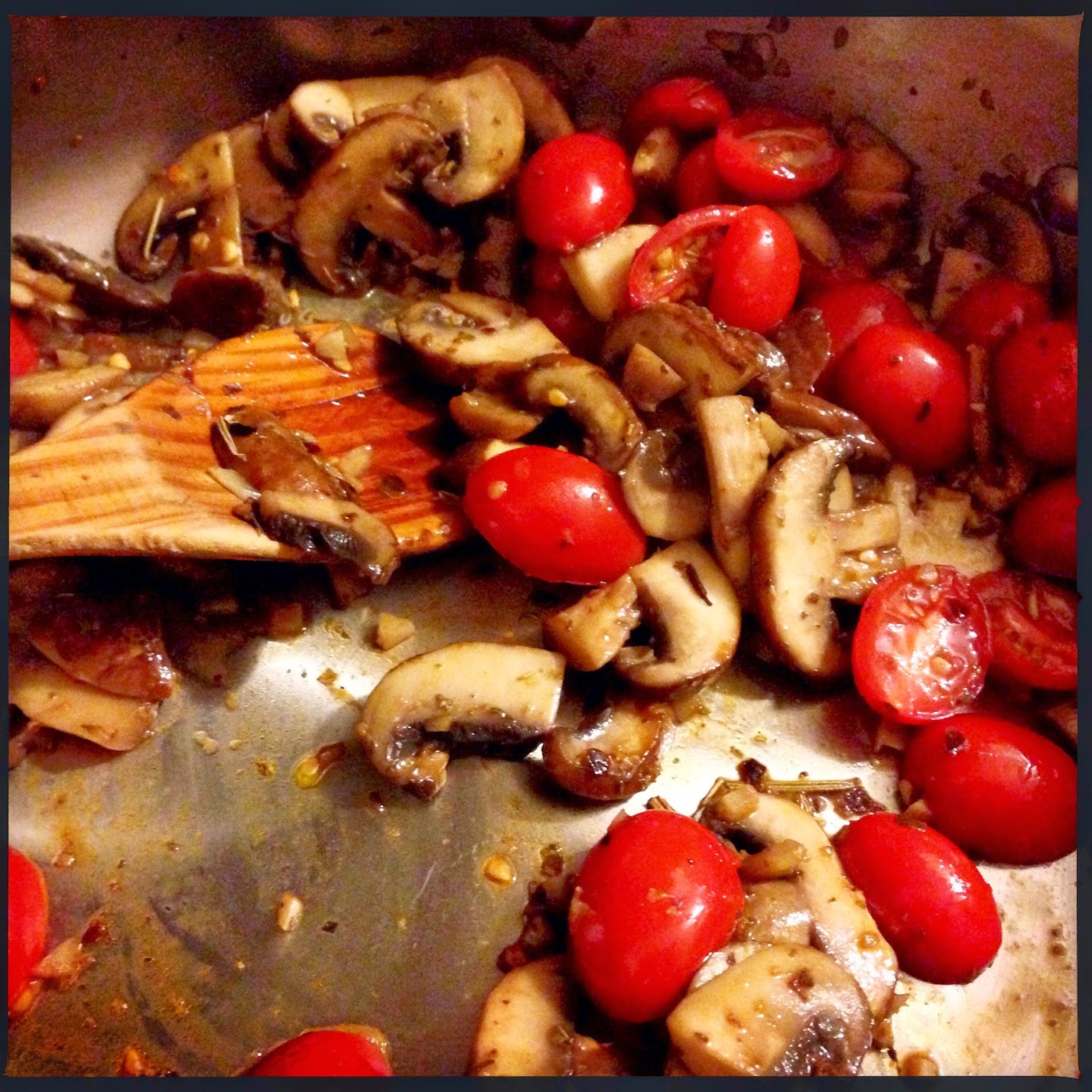 3. Add pasta, olive oil, and Parmesan cheese to pan with garlic, tomatoes, and mushrooms. Add pasta water if more “sauce” needed. Enjoy!