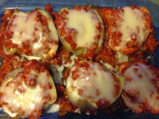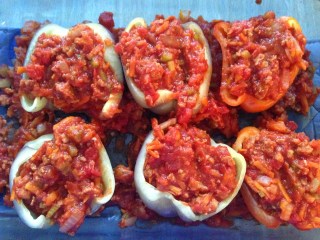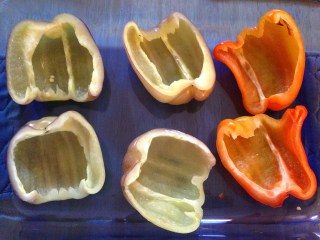 4. While sloppy joe mixture is cooking, place the peppers, cut side up, in a baking pan. Bake for 10-15 minutes, or until slightly softened. Remove from oven.