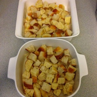 I got to spend the Thanksgiving holiday in Florida…turkey and palm trees are a pretty nice combination! My friends Susie and Robby came over for brunch one day and I decided to make a strata. Stratas are nice because it’s an all-in-one dish (eggs! bread! cheese!) that tastes great whatever you add to it, and you can prep it the night before. With inspiration from Kendrin’s marathon strata and Pinterest, I decided to go with spinach, bacon, and cheddar. I made this in two square baking dishes, so this recipe could easily be halved for a smaller crowd.