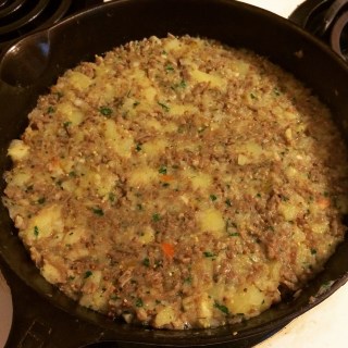 I have recently re-discovered my cast iron skillet, which was actually my grandmother’s cast iron skillet, so I’ve been trying to think of fun things to make in it. Unfortunately, this was a semi-failed attempt because it got kinda burned and I was not able to flip it as a patty, per the recipe instructions. My advice, don’t skimp on the butter. Next time I might try half butter, half canola or olive oil since it is hard for me to use that much butter in anything other than baked goods.