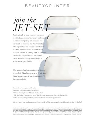 - The Jet-Set bag collection, our trio of 3 beautiful Beautycounter bags (retail value $86) which are perfect for transporting your Beautycounter products