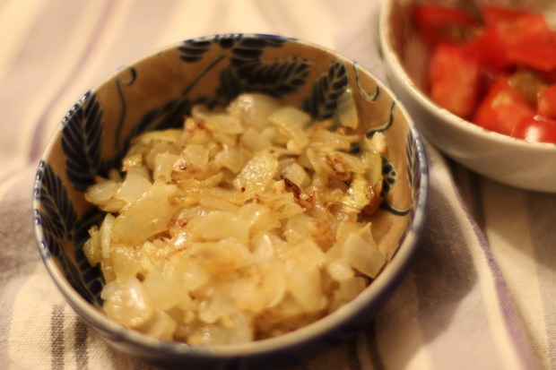 - While lentils are simmering, heat oil in a medium skillet over medium heat. Add remaining 1 cup onion and 1 minced garlic clove and sauté until tender and golden brown, about 10 minutes. Set aside.