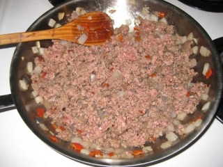 1. Heat olive oil over medium heat, then add onion and garlic and saute until translucent. Add ground beef, breaking it up with a spoon as it cooks. When beef is almost done cooking, add seasonings and rice.