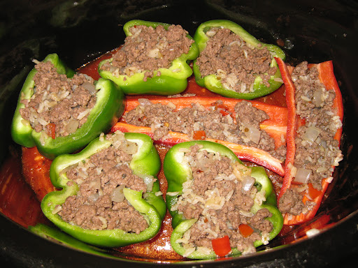 3. Fill bell pepper halves with meat mixture and place in slow cooker. Top with rest of tomato sauce (try to cover all of the peppers).
