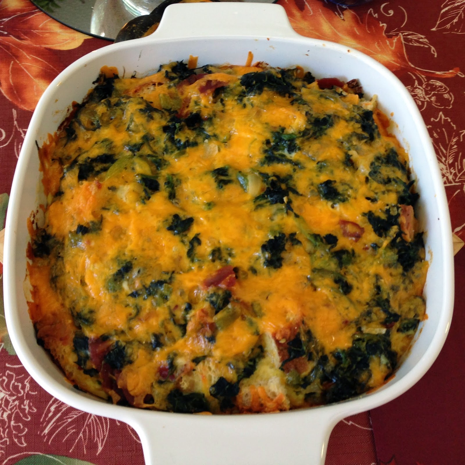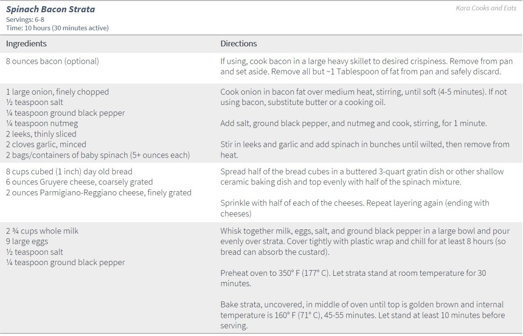 I got to spend the Thanksgiving holiday in Florida…turkey and palm trees are a pretty nice combination! My friends Susie and Robby came over for brunch one day and I decided to make a strata. Stratas are nice because it’s an all-in-one dish (eggs! bread! cheese!) that tastes great whatever you add to it, and you can prep it the night before. With inspiration from Kendrin’s marathon strata and Pinterest, I decided to go with spinach, bacon, and cheddar. I made this in two square baking dishes, so this recipe could easily be halved for a smaller crowd.