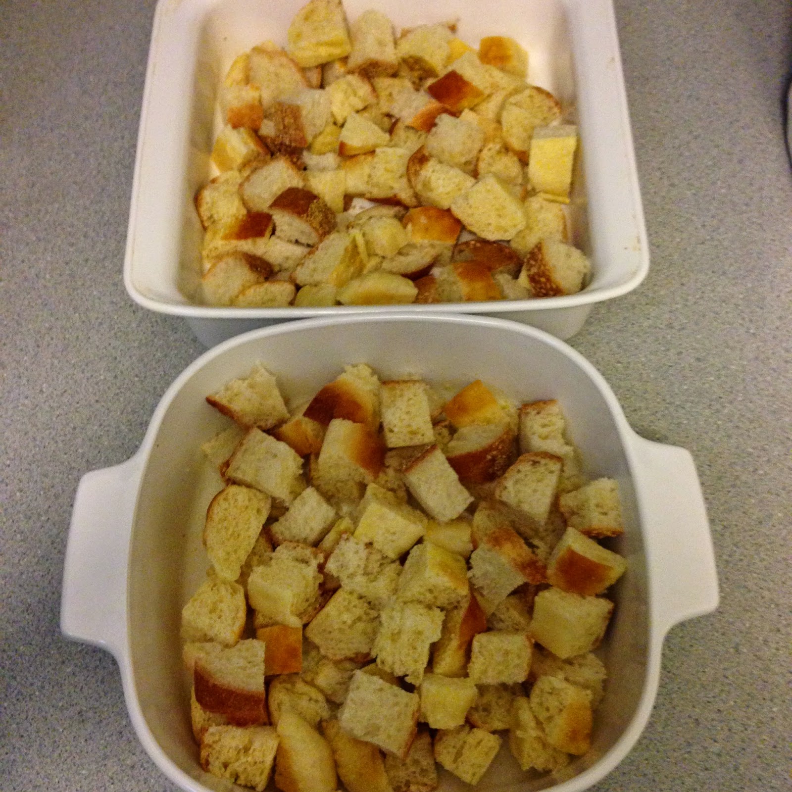 1. Spray a 13″x 9″ baking pan with cooking spray and layer the bread cubes in the bottom of the pan.