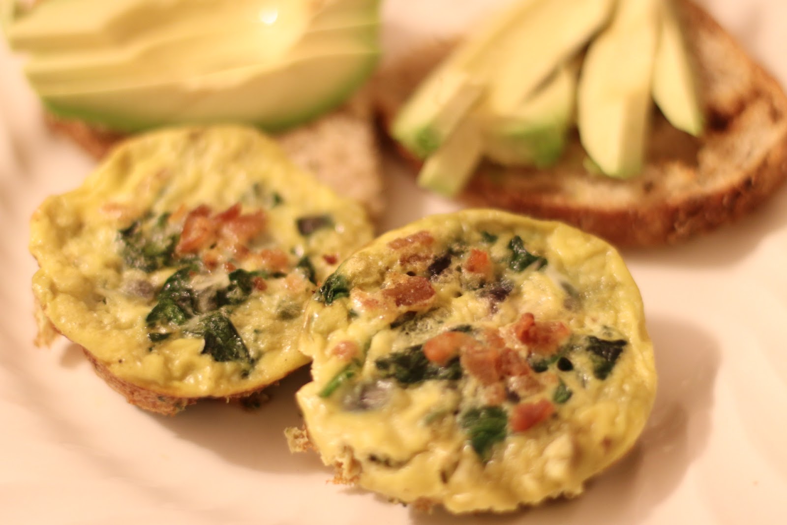 This is so my kind of recipe — prep once, use what you have, and there’s breakfast for days. With a basic base of eggs and milk (I am obsessed with almond/coconut milk these days), you can get creative with whatever else you want to throw in. The original recipe had spinach, goat cheese, roasted red pepper, and prosciutto. I went with spinach, red onion, shredded mozzarella, and crumbled bacon…the frozen, real bacon kind, not the bacon bits kind.
