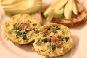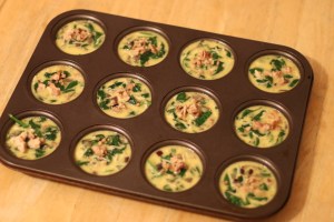 4. Divide egg mixture evenly into muffin pan cups (about 1/4 cup each) and top each with crumbled bacon. Bake 20-25 minutes or until center is just set.