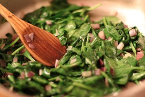 1. In a large saute pan, heat olive oil over medium heat. Add onion and cook 3-4 minutes until softened. Stir in spinach and cook until just wilted. Remove from heat.