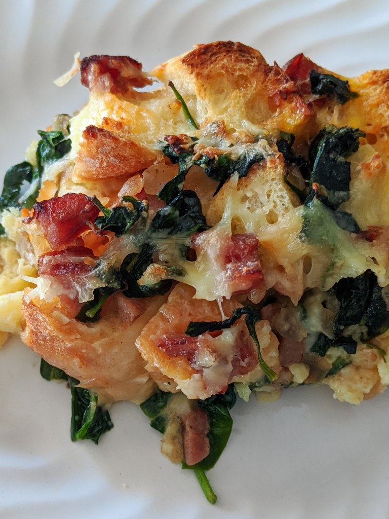 I recently made this recipe for a brunch, and made it again to use up some stale bread as part of #quarantinecooking. I’ve updated it a bit (hello bacon! hi, new photos!), but it’s also one of those recipes you can play around with. I do think the combination of Gruyere (or Comte) and Parmigiano are key though. The original adaptation was based on this Epicurious recipe.
