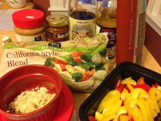 I had to do a bit of improv with this recipe because I forgot to buy carrots, and the fresh snow peas didn’t look so fresh at the grocery store. I decided instead to use a bag of “California style blend” frozen vegetables, which has broccoli, cauliflower, and carrots. Carrot problem solved!