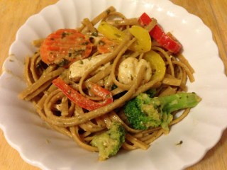 4. Combine carrots, peanut butter sauce, veggies, and pasta. Toss well. Sprinkle with cilantro and enjoy!