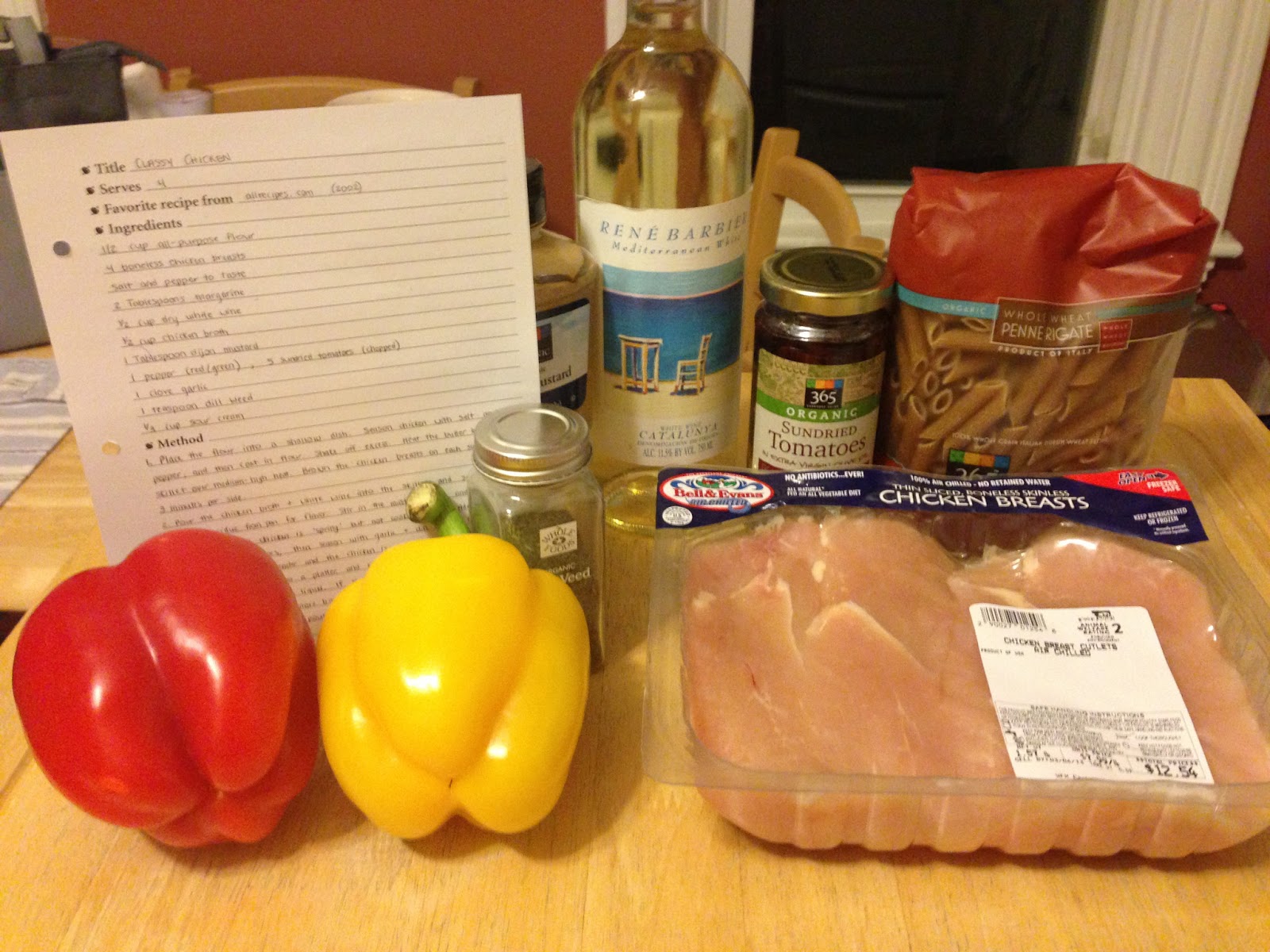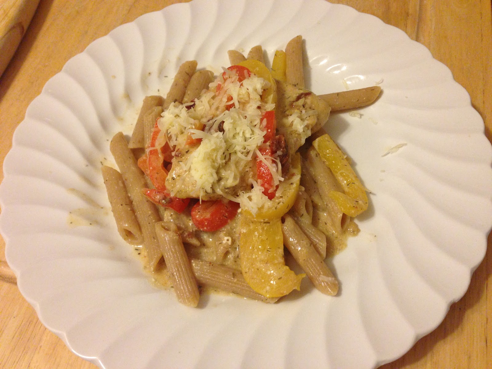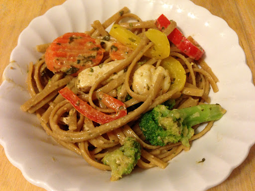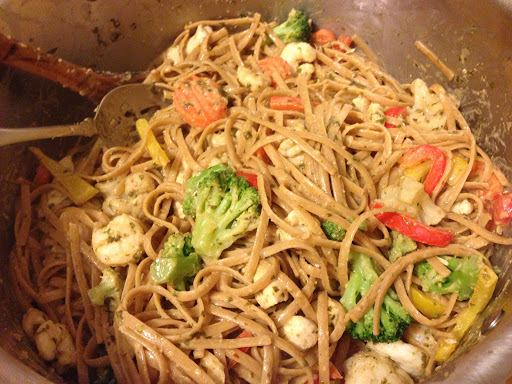 This recipe requires three burners on your stove, which I find a little hard to manage all at once. To make it a little less overwhelming, I made the sauce while cooking the pasta, then tossed the cooked pasta with the sauce to prevent the noodles from sticking together. After that I sauteed the chicken, shrimp, and vegetables. I used two chicken breasts and about a half-pound of shrimp.