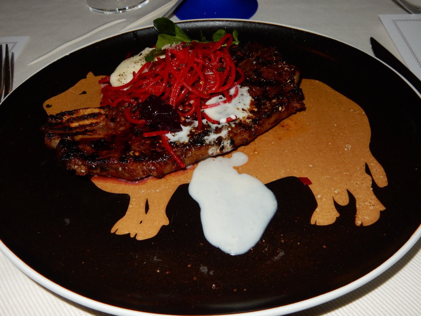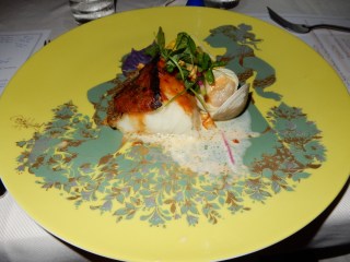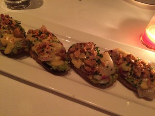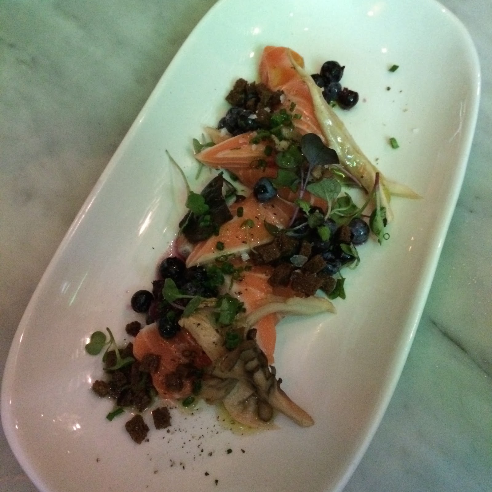 The raw bar was next, with a selection of the day’s oysters and the crudo of the day. And this is where I just can’t ever seem to take notes fast enough. The oysters were East Beach Blondes (Ninigret Pond, RI), First Encounter (Eastham), and Peter’s Point (Buzzards Bay, MA). I liked two of them better than the third, but I have no remembrance of which one was which anymore. I loved the fennel and chive mignonette that they came with; others loved the hot sauce. I don’t know if anyone tried the fish pepper cocktail sauce. The crudo was Alaskan King salmon with pickled Maine blueberries, oil-cured wild mushrooms, and rye crumble. This was outstanding…the combination made for perfect bites, especially with the crunch of the little croutons (I told you Kenny was a VIP).