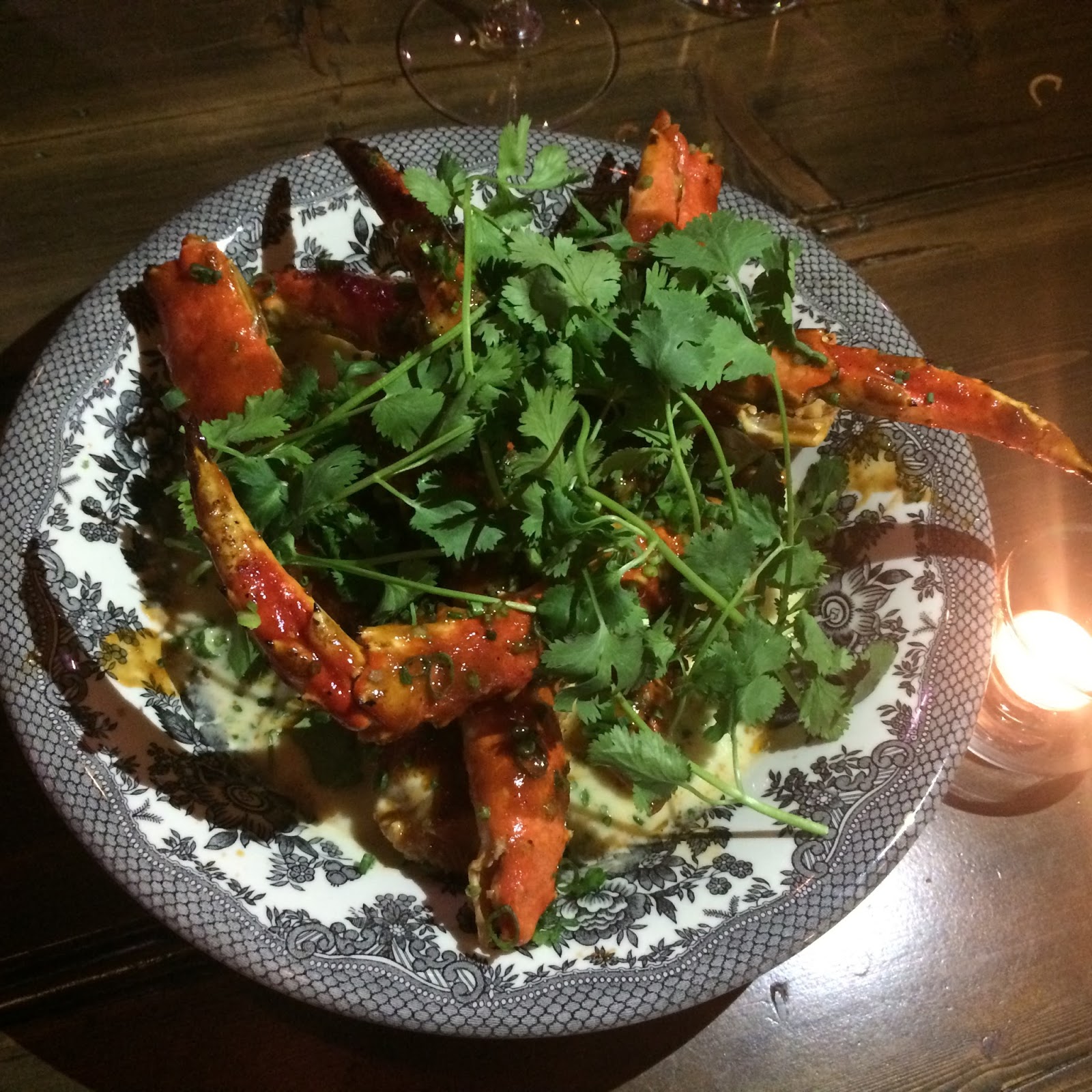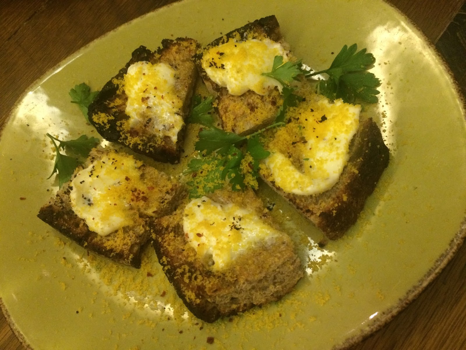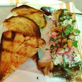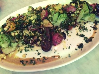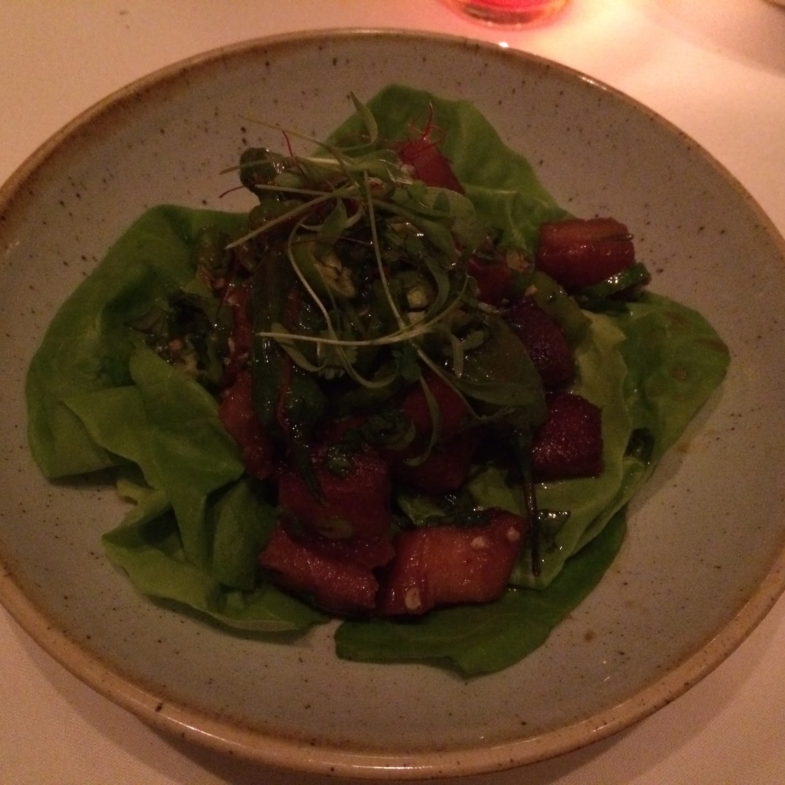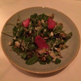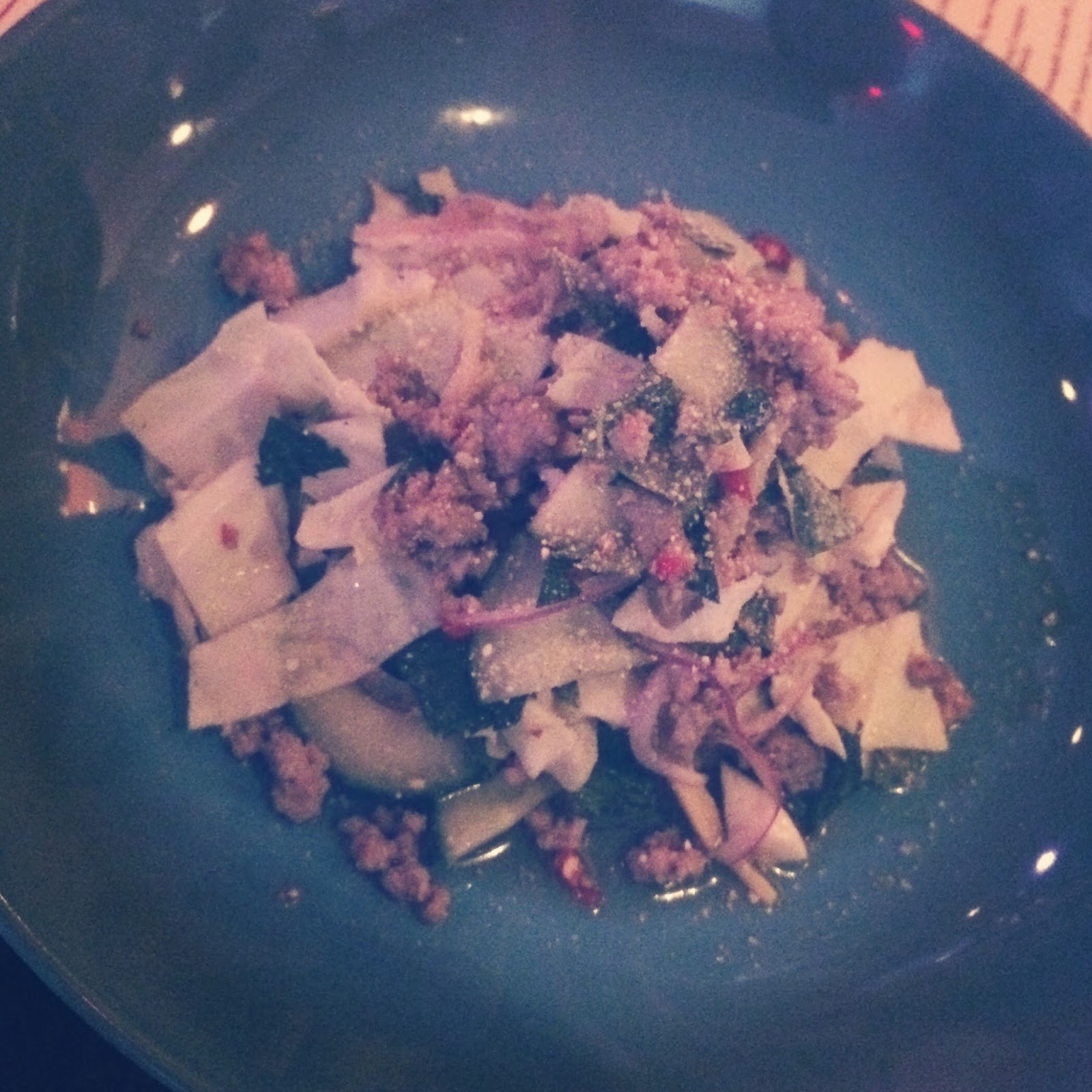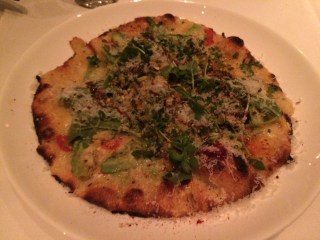 The menu is divided into snacks, raw bar, pizza, pasta, roasts (for 2-3), and plates. We wanted to be equal opportunity and try something from each section. First up, by way of a recommendation from the host, was the house made breads with smoked seaweed butter and walnut & anchovy dip. Kenny is the pastry chef and we were told he baked this bread for us that morning. It was fancy bread…seaweed bread, fish sauce baguette, and squid ink bread…and it tasted like bread. Kenny is definitely a VIP on the menu as he also has a hand in several other dishes, with all of his tasty crumbles and croutons. The seaweed butter and dip were also yummy. But as someone at the table pointed out, “I love butter, don’t care what’s in it.”