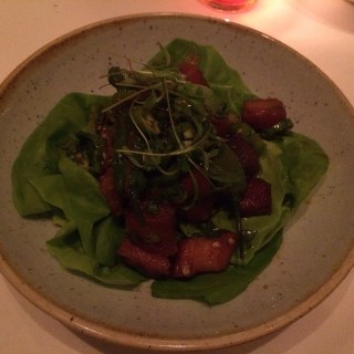 Next it was on to the clam pizza and the char belly. The chopped clam came with parsley, peperoncino, and pecorino and was delish. It was super thin, super lemony and those “clams did not come out of can” (said Tracy). Now normally I love char, but this dish was a little underwhelming. Perhaps it was because there was so many other standouts throughout the meal.