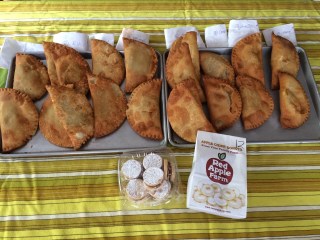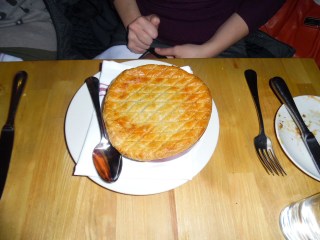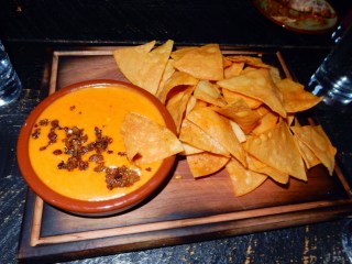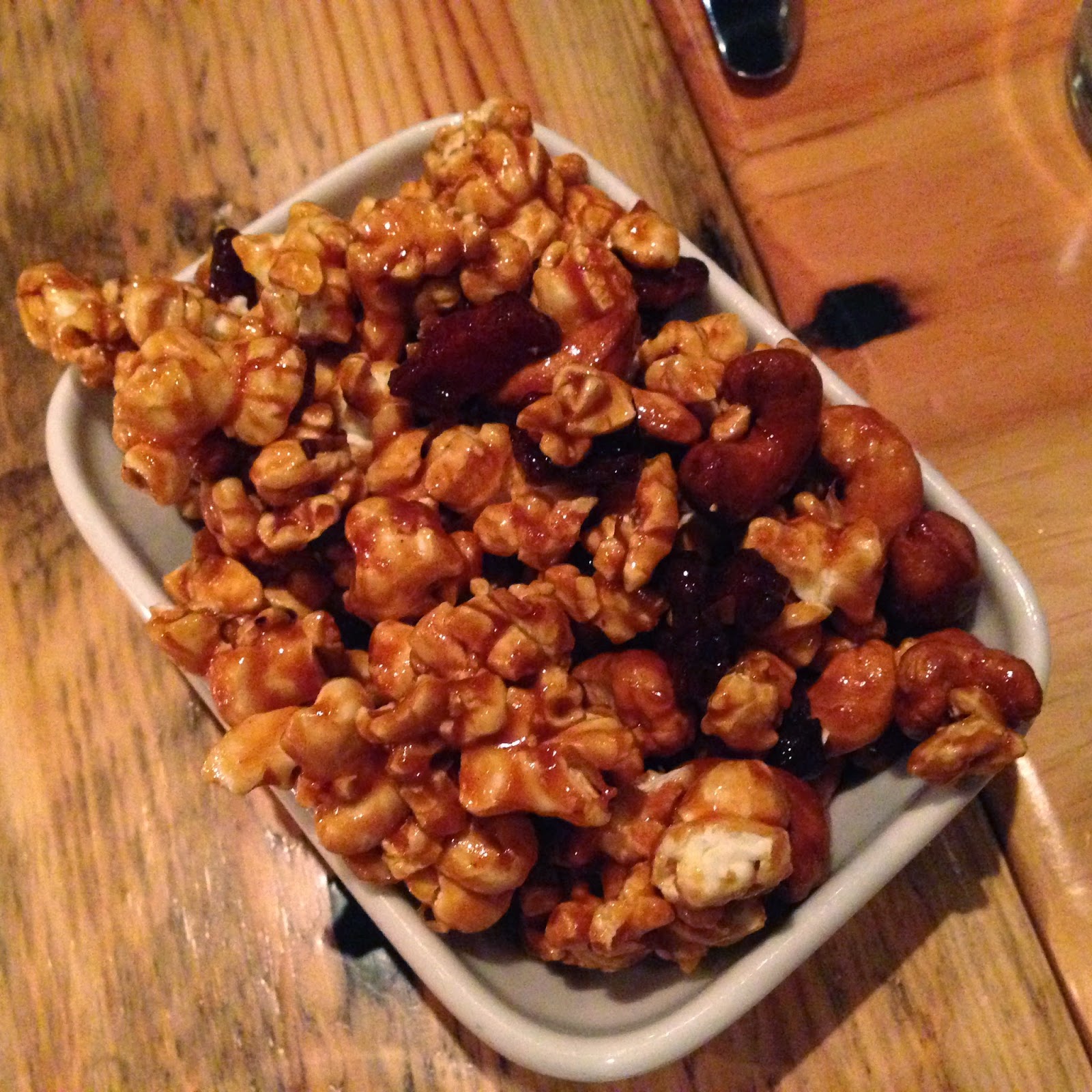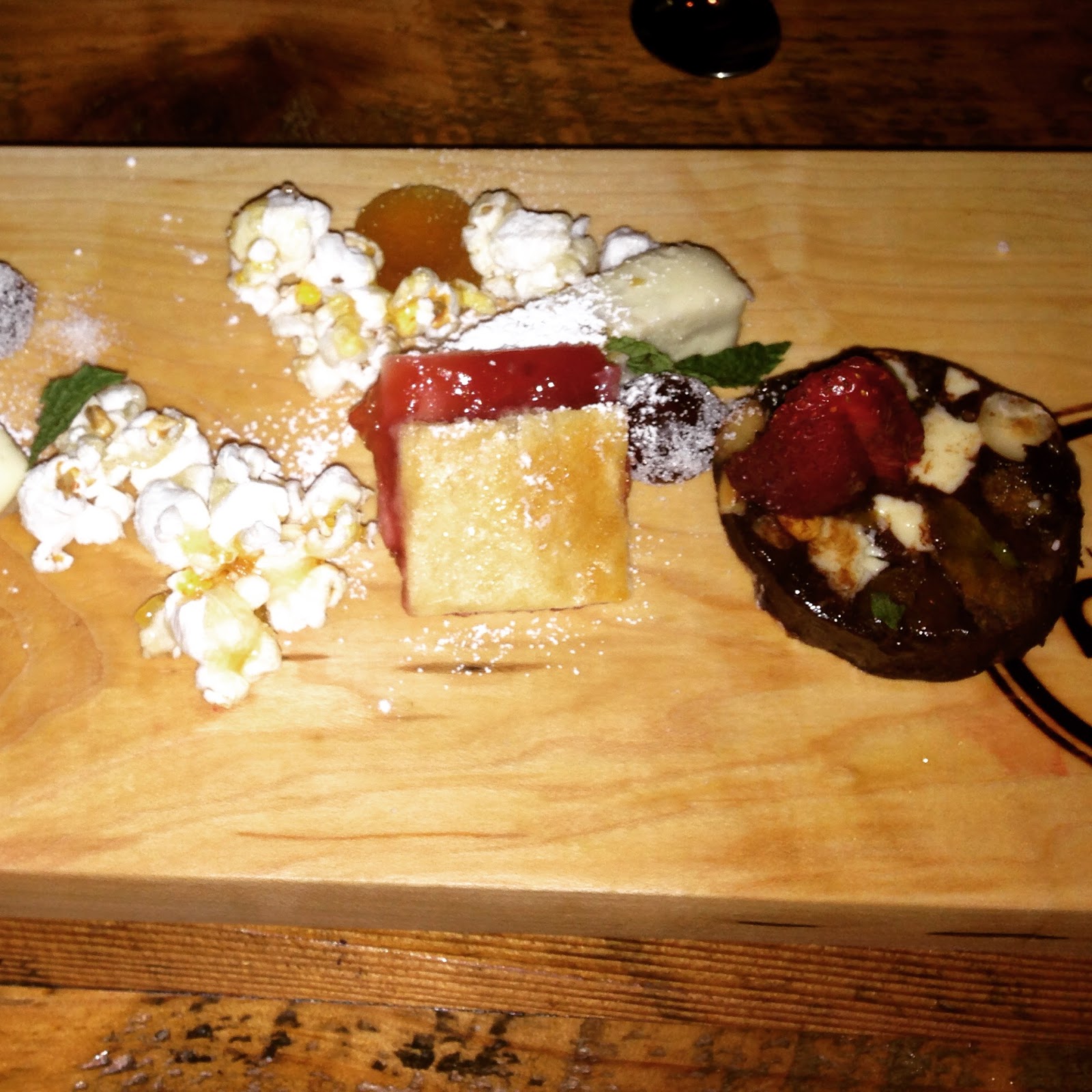 And finally, for dessert, we got both the liquid cheesecake trifle with fudge and whipped cream and the dessert charcuterie. The charcuterie board had chocolate salami, caramel Parmesan popcorn, stone fruit shortbread, and almond Bisq-otti dipped in white chocolate. In addition, we had some treats that Claire brought back from her recent trip to Norway, blue cheese chocolates (Blaskimmelost) and salted licorice (salt lakrids).