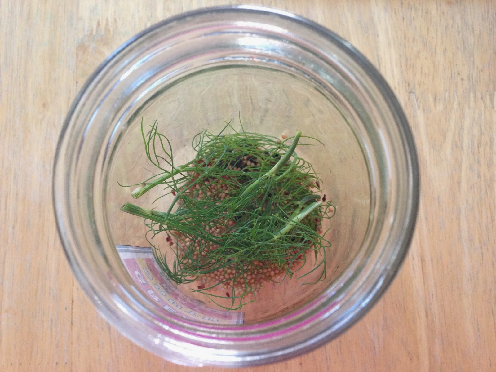 1. Wash and trim beans. To bottom of jar, add mustard seed, black peppercorns, red pepper flakes, garlic, and dill. Pack the green beans into the jar tightly so that they are standing up.
