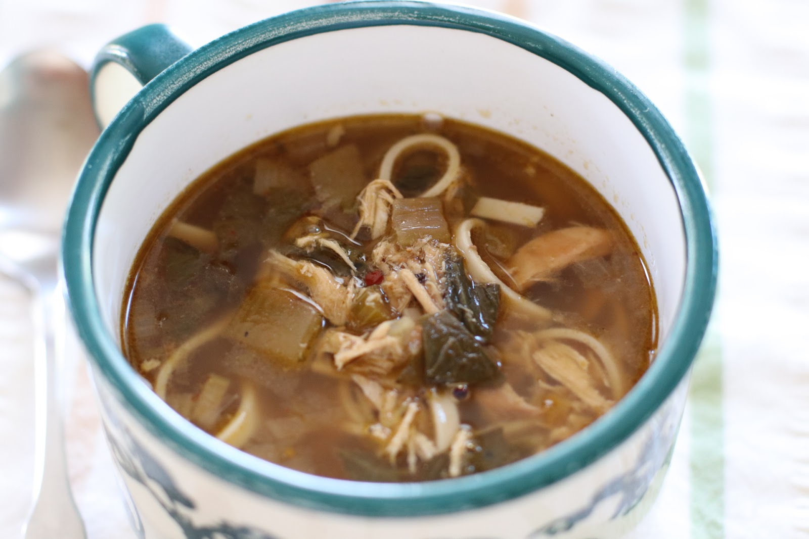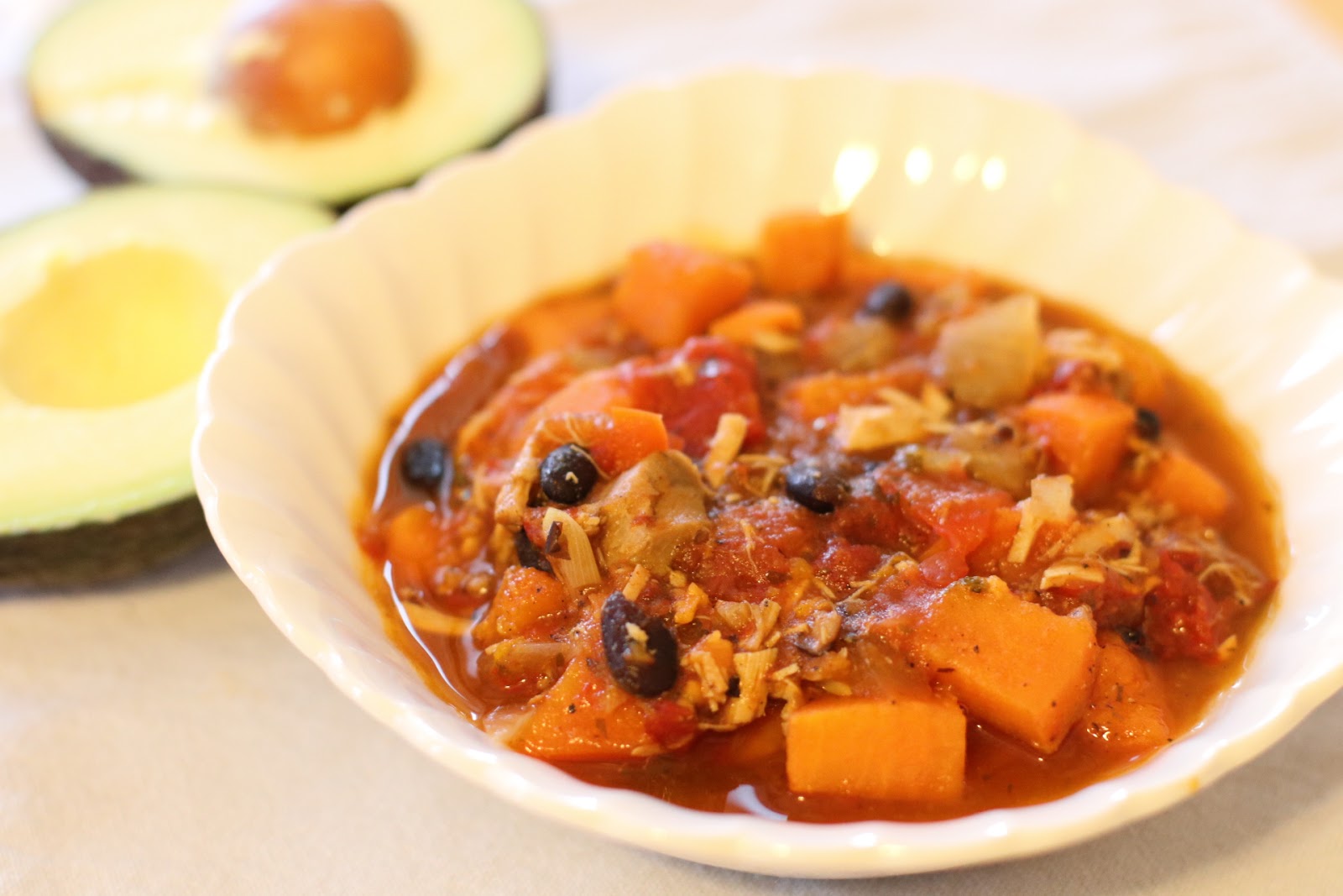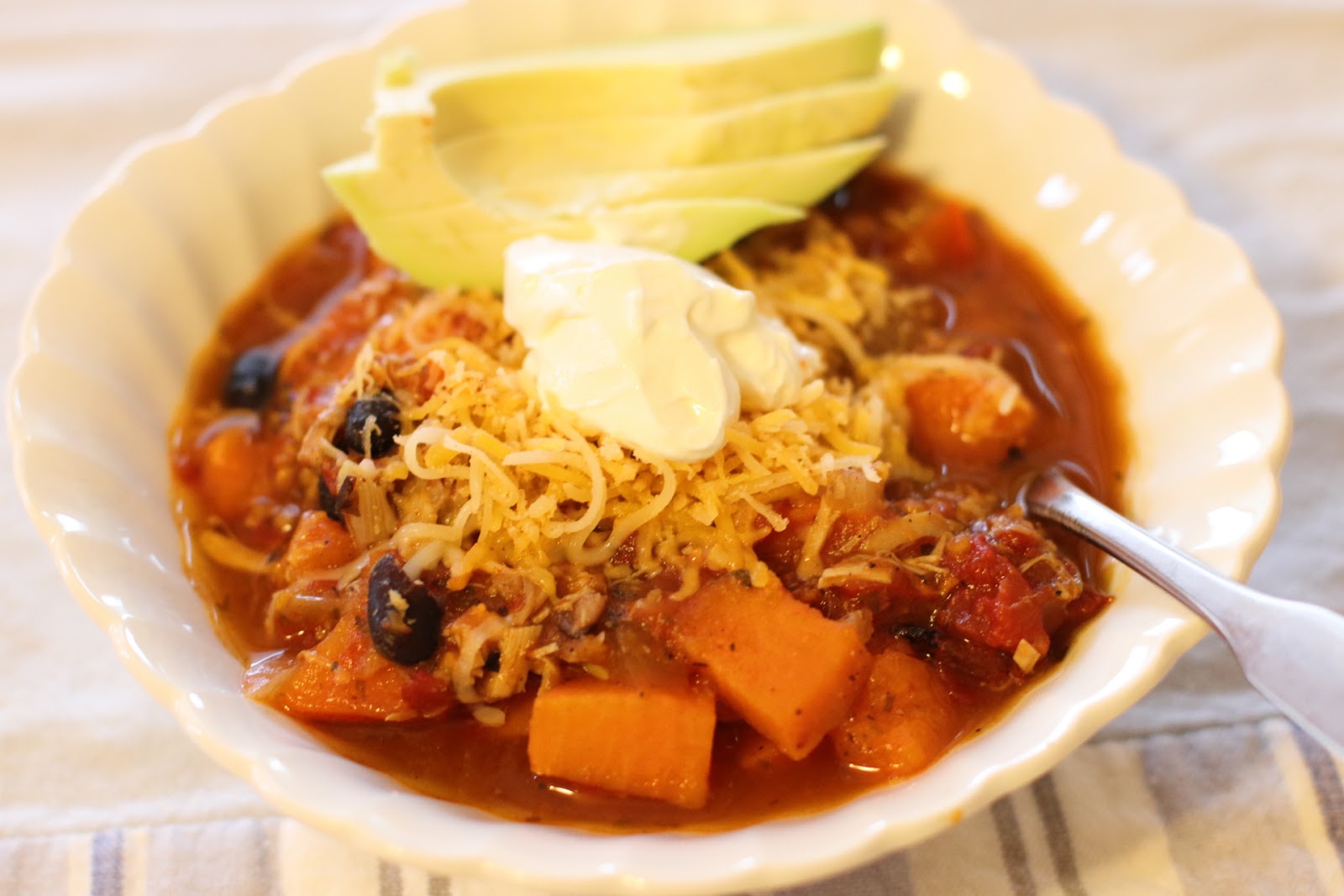 I was recently looking for a recipe that would set me up with lunches for the week. I was inspired by this recipe for sweet potato chili by Cotter Crunch and decided to do a little freezer clean-out at the same time. That means that my version became a sweet potato chicken chili, using some leftover roasted chicken, homemade broth, and black beans.