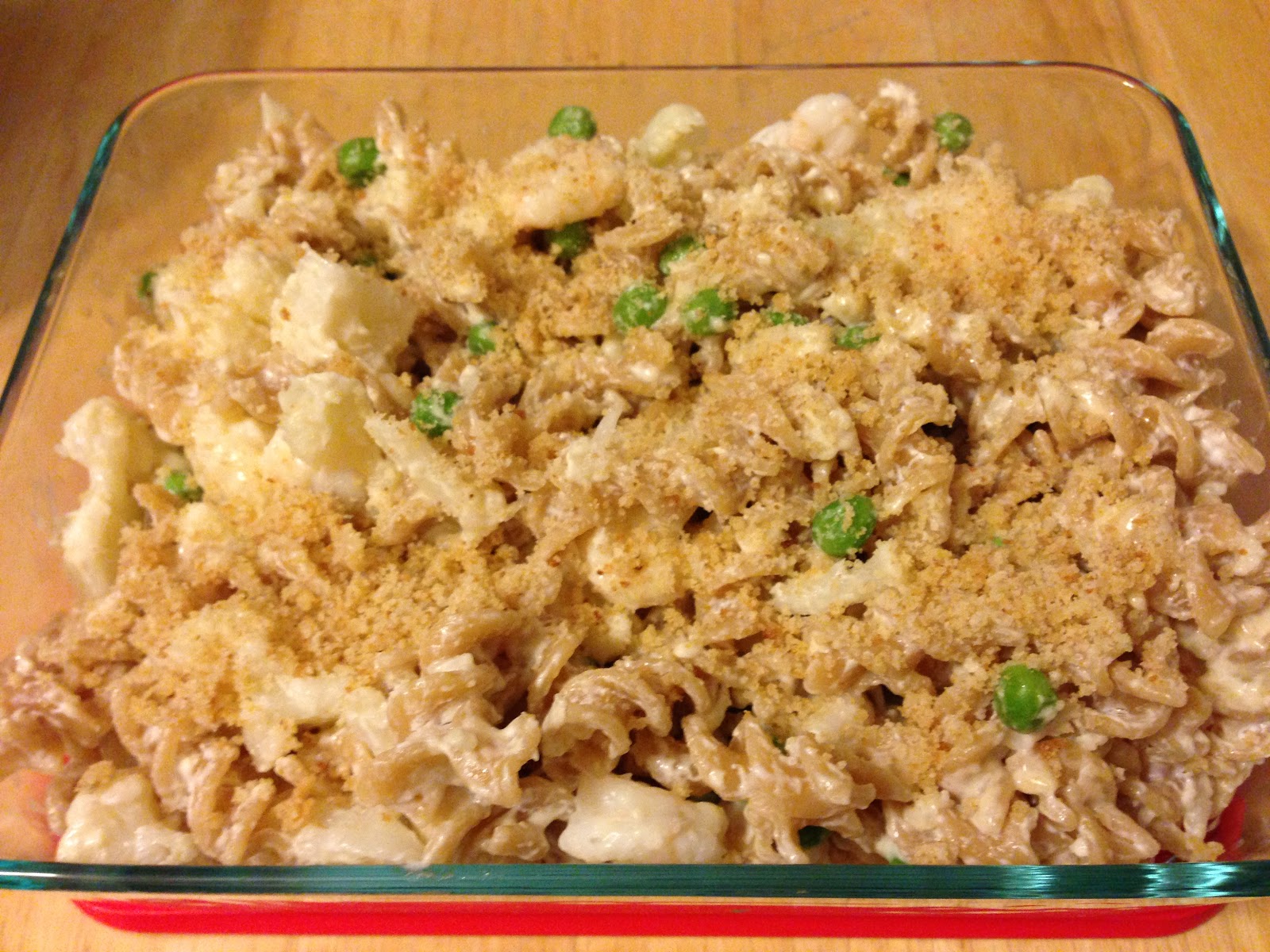 With temperatures in the single digits this week, I have been craving comfort food…and nothing says comfort more than mac ‘n’ cheese. There are so many ways to make macaroni and cheese, not even counting the powdered cheese varieties. This is an easy and fairly healthy stovetop verson that I like because after cooking the pasta and cauliflower, you can pretty much just mix everything else together. I inadvertently made it a bit healthier when I discovered I did not have enough butter (the December cookie marathon wiped out my butter supply) and had to substitute olive oil (2 Tbsp). Though perhaps that was a trade-off nutritionally with the regular (full-fat) sour cream I used.
